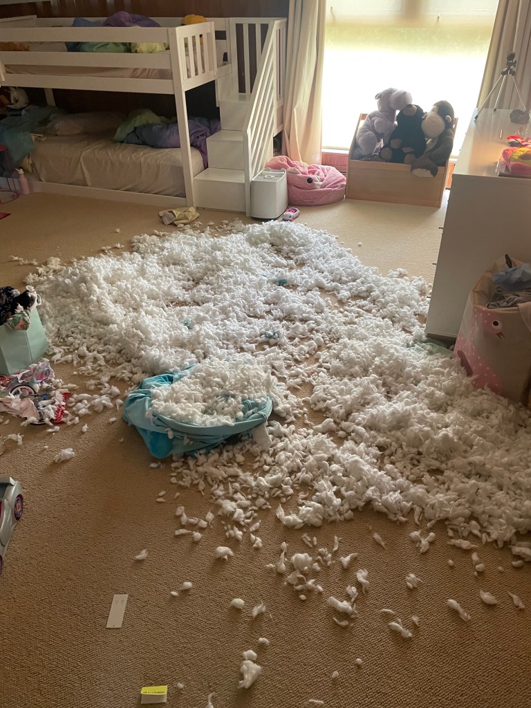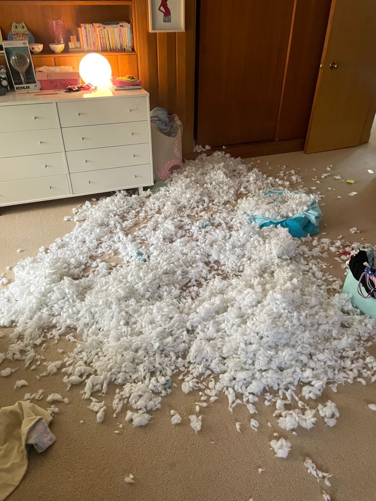 My nap ended abruptly when the Squishmallow’s owner came into the room, shouting and sobbing inconsolably. She had found her friend murdered and disemboweled on the floor of her room, murdered by another friend. I felt terrible for her and angry at the dog. I hauled him upstairs and put his face in it. I called him a bad dog, hoping that even if it was poor dog ownership, my daughter might feel my desire to stick up for her feelings.