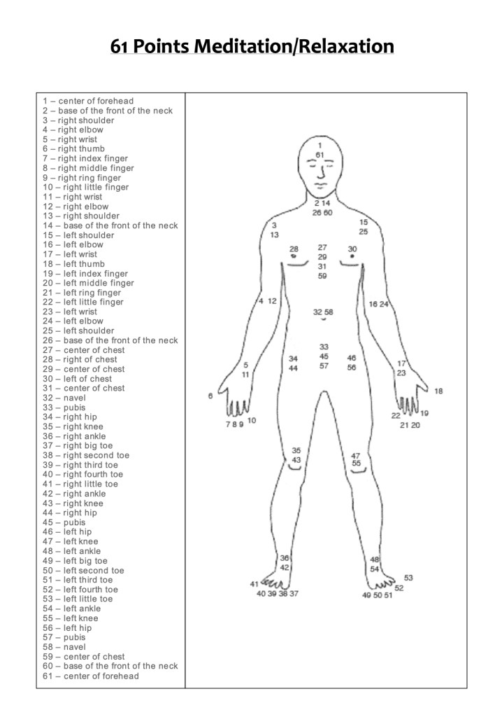 This is a technique I first encountered in a wonderful book called The Tibetan Yogas of Dream and Sleep, by Tenzin Wangyal Rinpoche. In it, the author introduces the 61 points as a method to induce lucid dreaming, but it can also be used as a stand-alone technique to calm the mind or as an entry point into yoga nidra, a state of non-sleep deep rest.